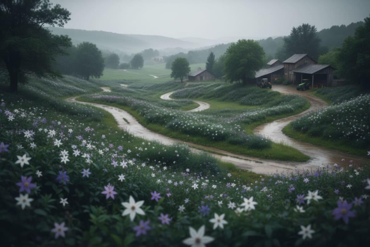 마지막으로 소개해 드릴 낭만은 바로, 비 오는 날의 별꽃농장 풍경 속에서 만끽하는 여유로운 휴식입니다. 사실 비 오는 날의 별꽃농장은 그 자체로 한 편의 시와 같습니다. 빗물에 젖어 더욱 진한 초록빛을 띠는 나뭇잎들, 빗방울을 머금은 채 영롱하게 빛나는 꽃잎들은 그 어떤 화려한 색채보다 깊은 감동을 선사합니다. 몽환적으로 피어오르는 안개는 농장 전체를 신비로운 분위기로 감싸며, 마치 동화 속에 들어온 듯한 착각을 불러일으키죠.